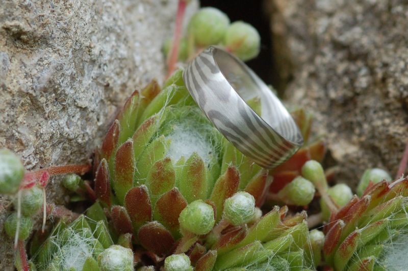 In meiner Werkstatt forme ich aus fein geschichteten Metalllagen Ringe, deren Linien an Holzmaserungen oder natürliche Strukturen erinnern. Jede Bewegung des Schmiedens und Drehens sowie das Verletzen der Oberfläche mit anschließendem Planschmiedens prägt das Muster – und macht jeden Ring zu einem Unikat.